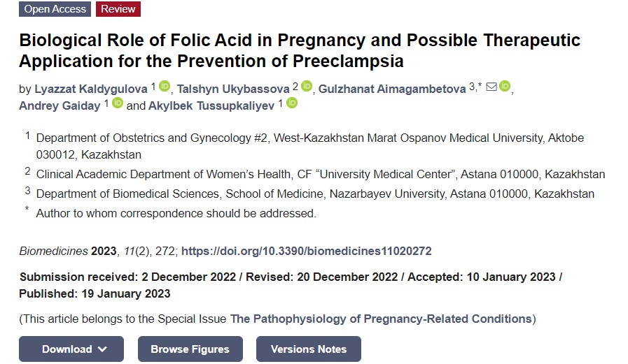 [1] Kaldõgulova L, Ukybassova T, Aimagambetova G et al. Foolhappe bioloogiline roll raseduse ajal ja võimalik ravi Taotlus preeklampsia ennetamiseks. Biomedicines, 2023, 11(2): 272.https://doi.org/10.3390/biomedicines11020272