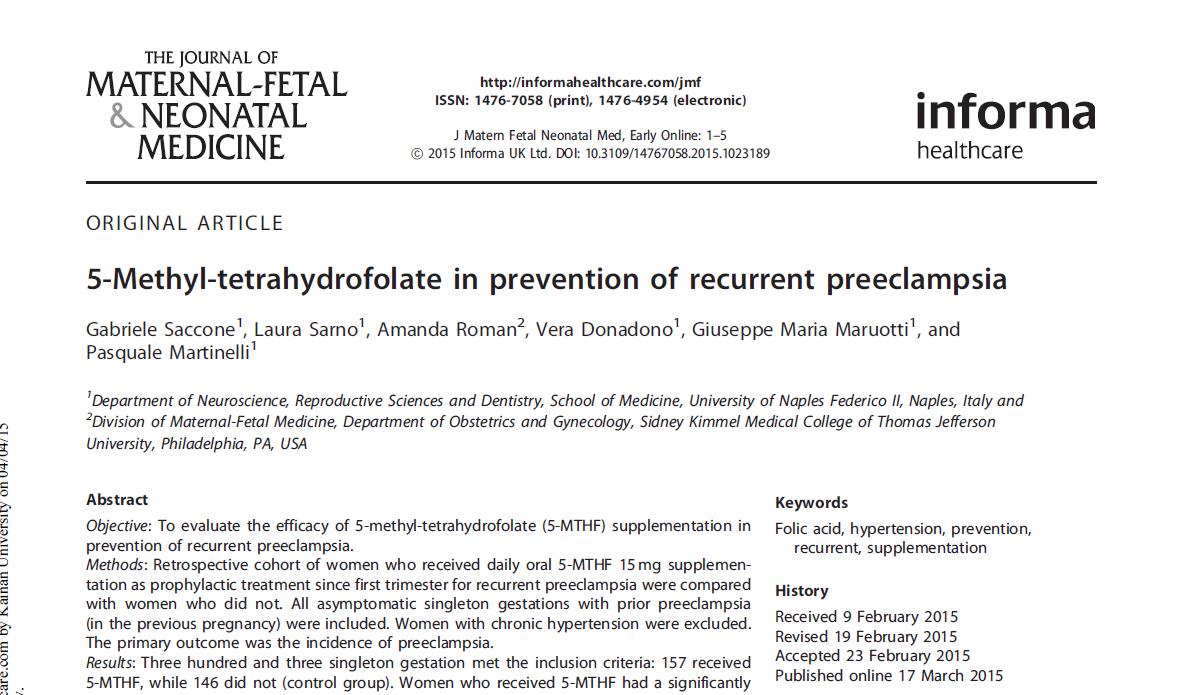 2015. aasta itaallane retrospektiivne kohortuuring (n = 303 eelneva preeklampsiaga naist) näitas, et 15 mg 5-MTHF päevas alates esimesest trimestrist vähendas üldist kordumist preeklampsia 39,7% kuni 21,7% (OR 0,57, 95% CI 0,25–0,69), raske preeklampsia 8,9% kuni 3,2% (OR 0,44, 95% CI 0,12–0,97) ja varane algus preeklampsia 7,5% kuni 1,9% (OR 0,34, 95% CI 0,07–0,87) [2].