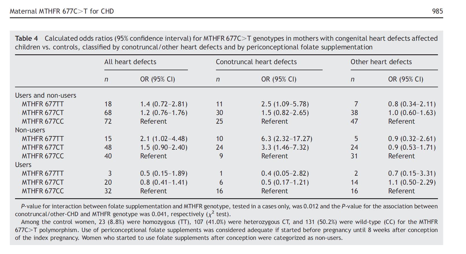 165 kaasasündinud perekonna hulgas südamehaigus (CHD) ja 220 kontrollperekonda, emad, kes kandsid MTHFR 677 CT või TT genotüüp ja EI olnud võtnud perikontseptsioonseid folaadilisandeid palju tõenäolisem, et lapsel on juhtivuse tüüpi südamedefektid (VÕI 3.3 ja 6.3).