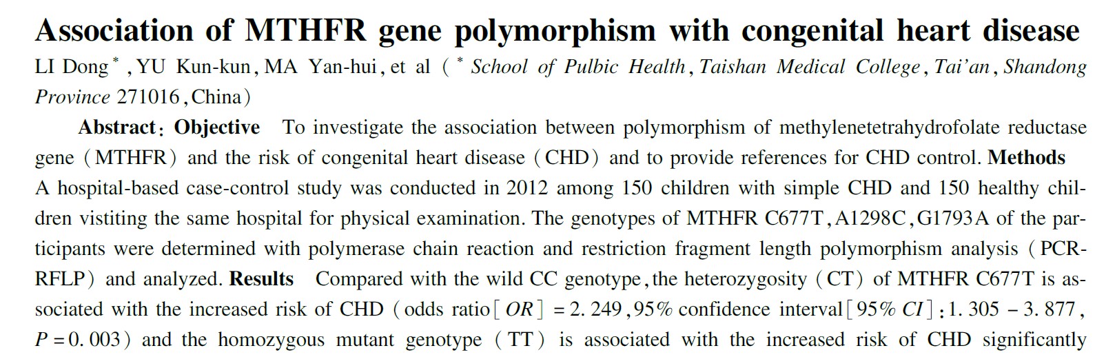 Shandongi Qilu lastehaigla uuring Ülikool näitas, et MTHFR C677T T-alleel suurendab CHD tõenäosust 1,8 korda; TT ja CT genotüübid suurendavad riski 3,1- ja 2,2-kordseks.