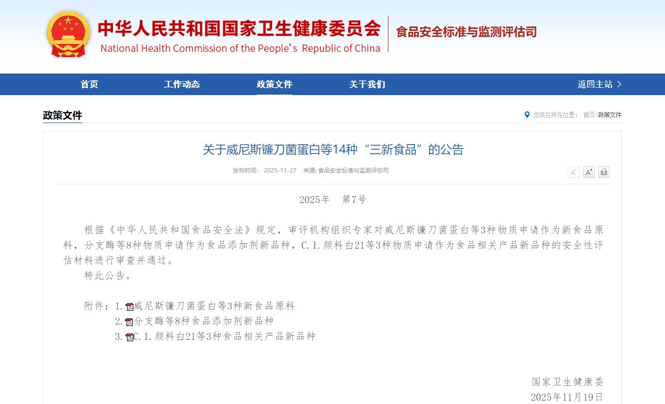 [1] Hiina Rahvavabariigi riiklik tervisekomisjon.Teadaanne 14 "Kolm uut toitu", sealhulgas Veneetsia Fusarium Protein (2025, nr 7).