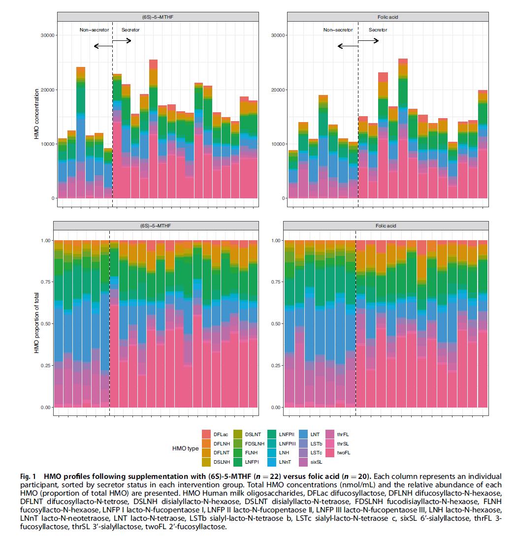 Sellest uuringust ilmnes ootamatu leid: kuigi kogu HMO tase ei erinenud kahe rühma vahel oluliselt, Metaboliseerimata foolhappe (UMFA) osakaal rinnapiimas foolhappe rühm saavutas koguni 29%, rohkem kui kümme korda suurem kui 5-MTHF rühm. Veelgi enam, andmete analüüs näitas, et UMFA tase oli kõrgem seotud madalama HMO üldkontsentratsiooniga ja oluliselt vähenenud 3′SL.