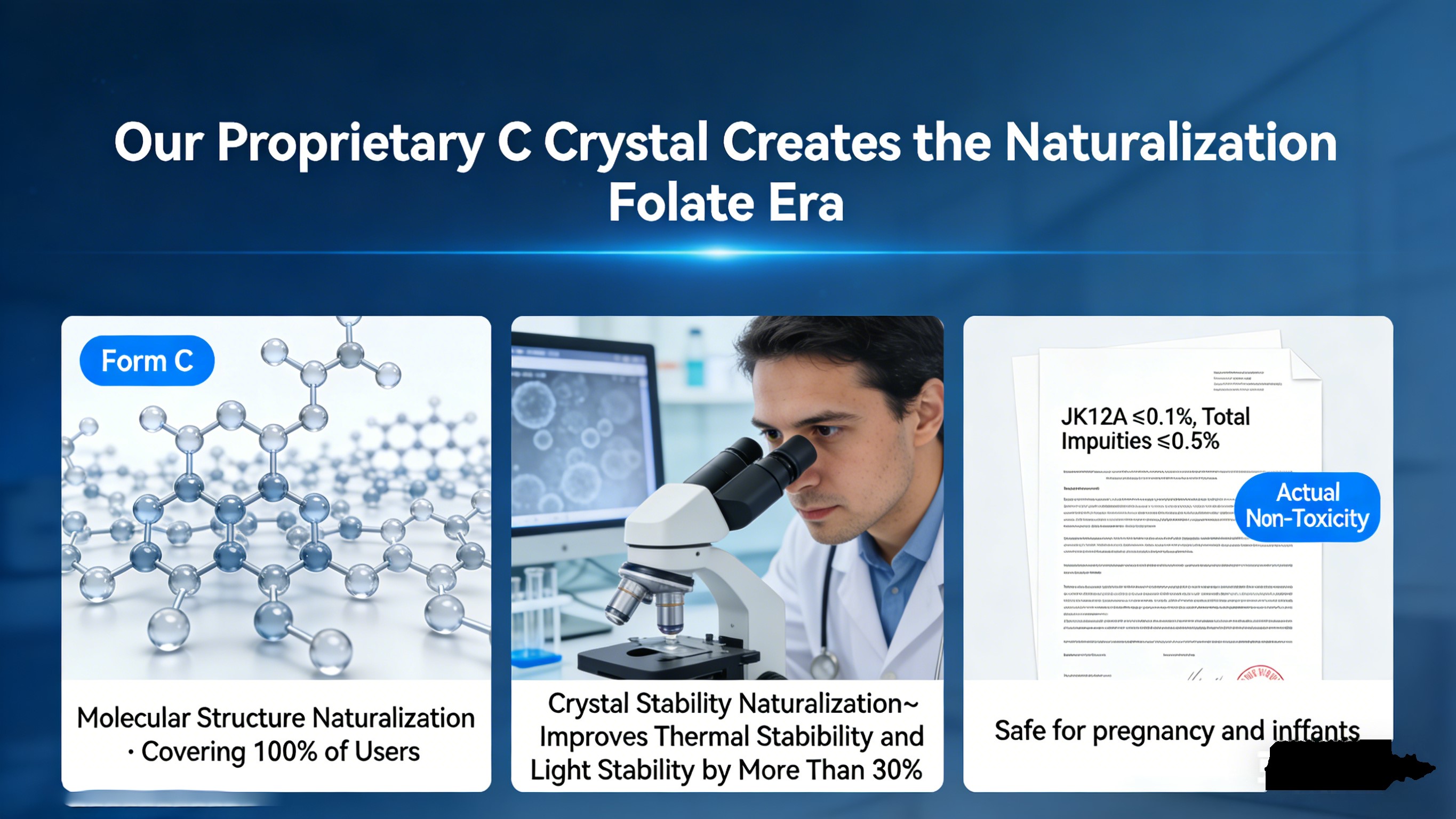 Meie C-kristalli patendi põhjal tegime teerajajaks Kategooria „Naturaliseerimise folaat”, mis teenib esimese ülemaailmse sertifikaadi. Tõsi Folaadi naturalisatsioon nõuab selgelt kolme põhikriteeriumi täitmist eristab seda üldisest I-kristalli aktiivsest folaadist: