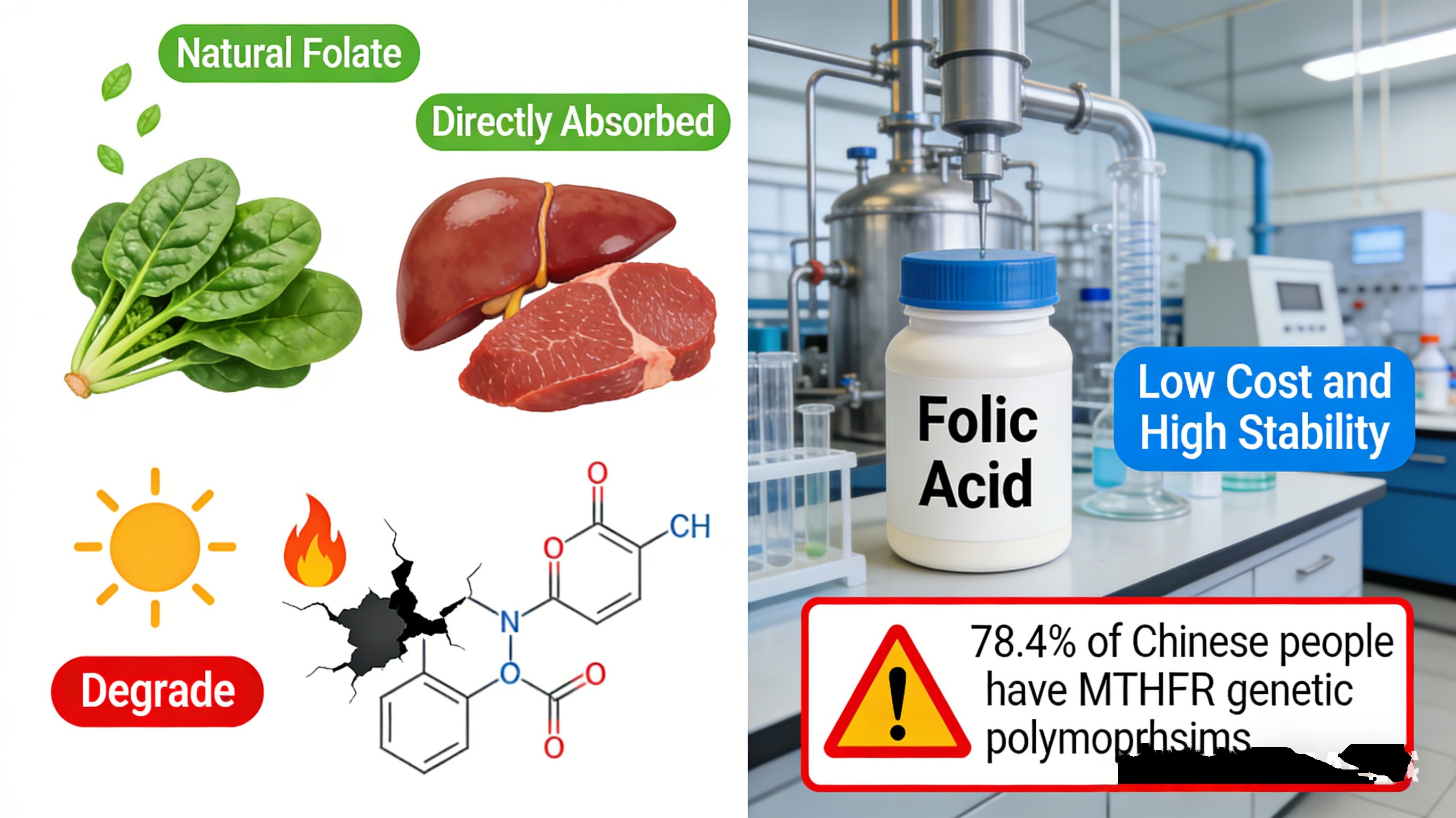 1945. aastal sünteetiline pteroüülmonoglutamiinhape — fool hape — töötati välja, kujundades ümber tööstust. Selle oksüdeeritud struktuur on äärmiselt stabiilne, odav toota ja skaleeritav, lahendades loodusliku folaadi masstootmise barjäär. Poole sajandi jooksul muutus foolhape globaalseks mainstream;80 riiki ja piirkonda andsid volitused selle teraviljaga kindlustamiseks. Enamik tavalisi folaadi toidulisandeid ja rikastatud toiduaineid sisaldavad foolhapet.