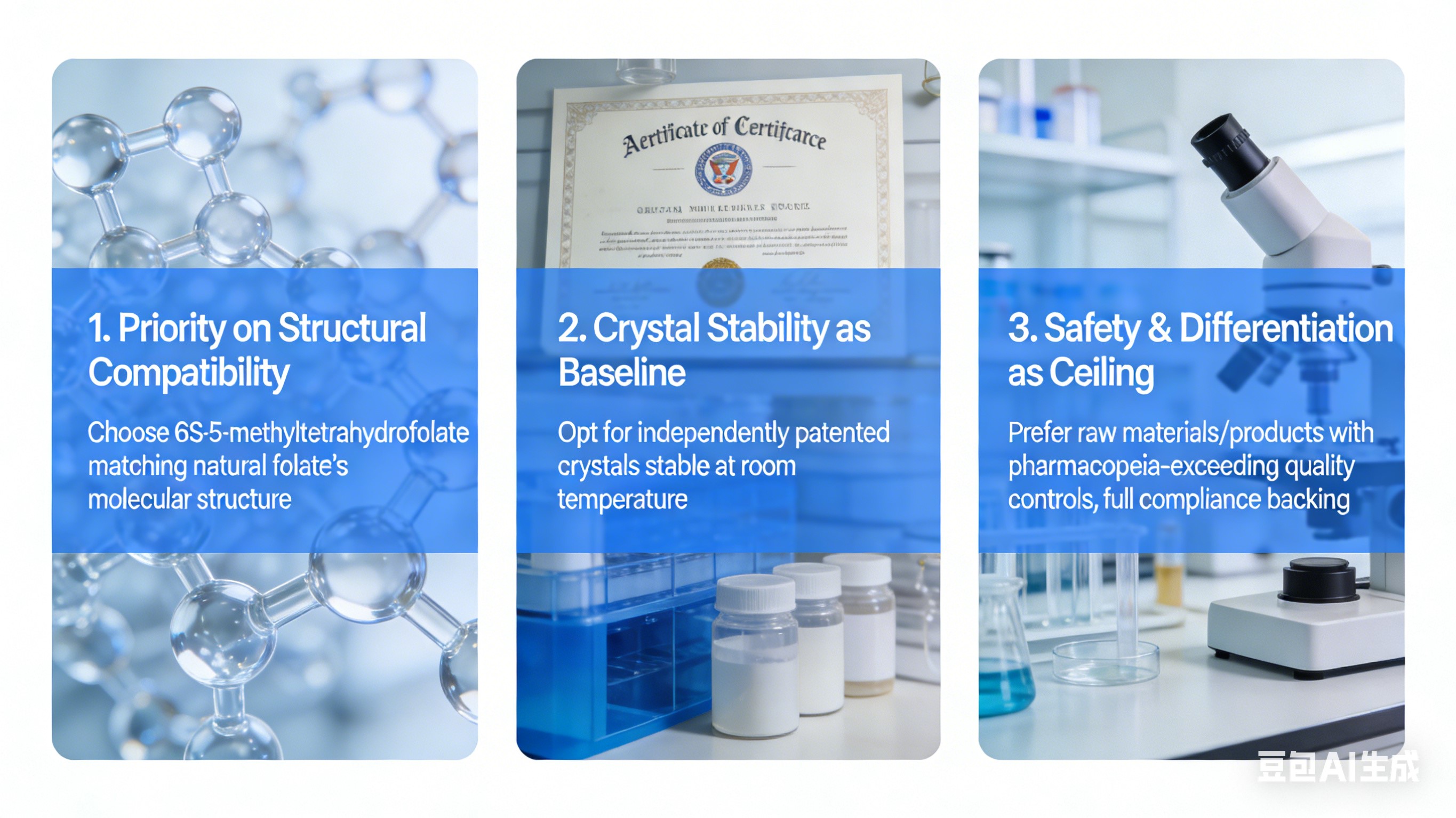 1. Struktuurilise ühilduvuse prioriteet: Valige sobivus 6S-5-metüültetrahüdrofolaadist looduslik folaadi molekulaarstruktuur – otsene imendumine, katab kõik kasutajatele, hoiab ära ebaefektiivsuse.2. Kristalli stabiilsus kui lähtetase: Valige iseseisvalt patenteeritud stabiilsed kristallid toatemperatuuril, et tagada partii konsistents ja etikett vastavust.